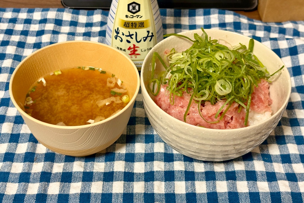 せっかく贅沢をするならと、刺身醤油にネギの大パックを購入!栄養も考えて味噌汁も用意しちゃったり!