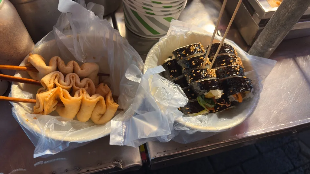 たくさんある屋台の中から僕が選んだのは、韓国の定番グルメである「キンパ」と「オムク」です!