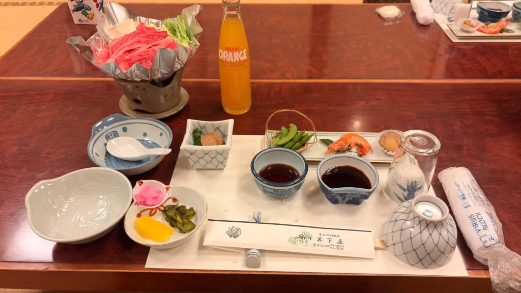 美しい霜降りの牛肉が鎮座するお鍋、丁寧に盛り付けられた前菜、そして懐かしい瓶のオレンジジュースが並ぶ光景は、どこか懐かしくも圧倒的な特別感がありました。